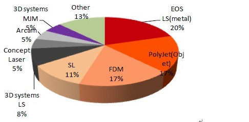 根據WohlersAssociates在2011-2012年的調查顯示:現階段,下游打印服務商安裝最多的是基于立體平板印刷(SL)技術的3D打印設備,占比高達40%。作為最早成形的3D打印技術,占據較高的市場份額在情理之中。同時,技術發展相對較晚,以金屬為材料的激光打印設備,占比已經接近20%。如圖50所示。